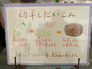切干しだいこんは、干すことでカルシウムなどの栄養素量が増えます。「おいしかったから、たくさん食べたよ!」と声をかけてくれる子がたくさんいました。