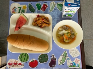 7月5日の給食の献立は、パエリア、ウインナーとキャベツのスープ、すいかでした。