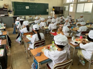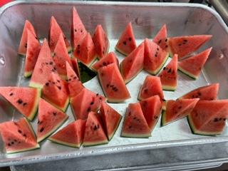 すいかは給食室で1玉を64等分に切ります。全員に甘い真ん中の部分が当たるように切り方にも工夫をしています!