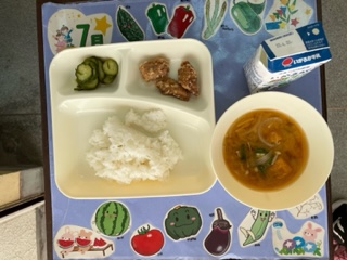 今日の給食は、豚肉のたつたあげ、みそ汁、きゅうりの甘酢あえでした。