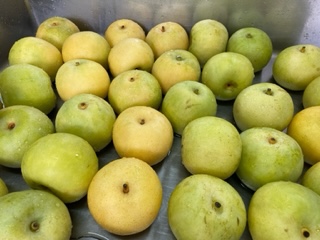 なしは、今が旬の果物です。おいしそうななしが給食室にたくさん届きました!シャキシャキとした食感が特徴の二十世紀なしでした。皮が青いので青なしといいます。
