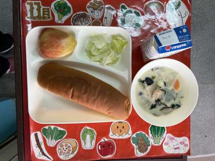 11月1日(火)のこんだては、きのこのクリームシチュー、キャベツのピクルス、りんご、パン、牛乳でした。