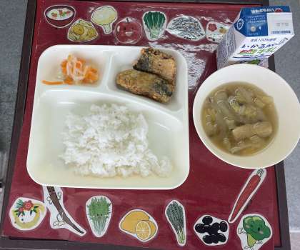 1月31日(火)のこんだては、さばのカレーたつたあげ、五目汁、紅白なますでした。さばのカレーたつたあげは、カレー味の衣でカリッとあがっていて、魚が苦手な子もよく食べていました。