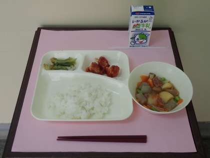 今日の給食には、まぐろのオーロラ煮が登場しました。
