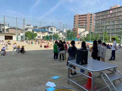 今日は2年生と4年生のにこにこ班が初めて顔を合わせて、輪っかくぐりをしました。
