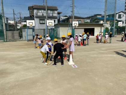 グループで手をつないで輪を作り、フラフープをグループで3周回す遊びをしました。5・6年生の集会委員会のお兄さんお姉さんが見本を見せてくれました。その様子を見て4年生が2年生にやさしく声をかけながら、楽しく遊ぶことができました。