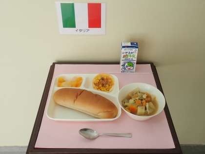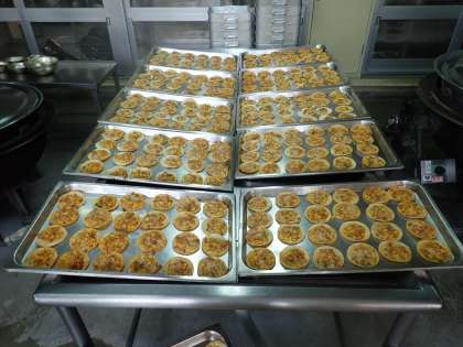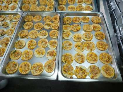 給食の変わりピザは、ぎょうざの皮に、ツナ、コーン、ピーマン、ピザソース、チーズを混ぜ合わせた具をのせ、焼き物機で焼いています。
