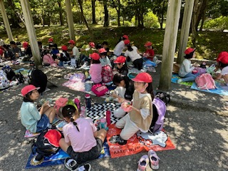 日本庭園でお弁当を食べました。美味しそうなお弁当に子どもたちは大喜びでした。