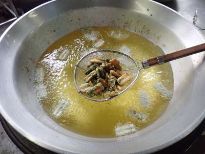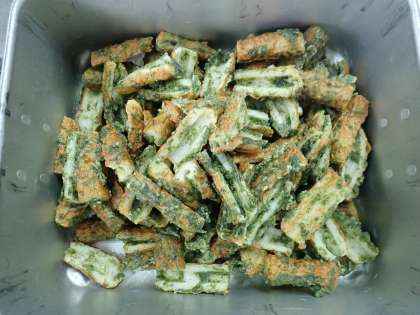 ちくわのいそべあげは、小麦粉、あおのり、水で作った衣に、切ったちくわをつけ、なたね油で揚げます。