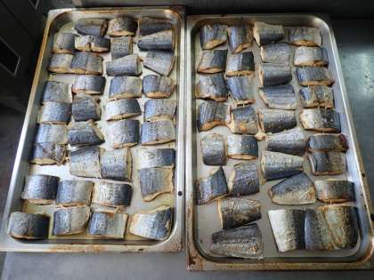今日のさごしは、料理酒、砂糖、みりん、こいくちしょうゆ、ゆず(果汁)で下味をつけ、焼き物機で焼いています。