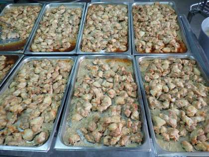料理酒、こいくちしょうゆで下味をつけた鶏肉にバターをかけて、焼き物機で焼いています。