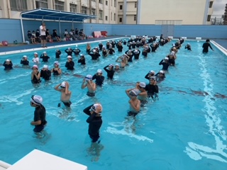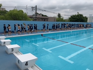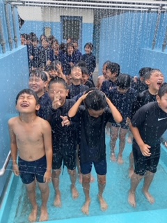 今日は今年初めてのプール水泳がありました。この学年はコロナの影響で水が苦手な子が多いので、今日は水中でダンスを踊って水に慣れる活動をしました。