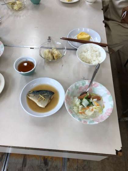 メニューは、魚の味噌煮やだし巻き玉子、白菜のクリーム煮に加えて、デザートにバナナ蒸しパンです。