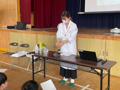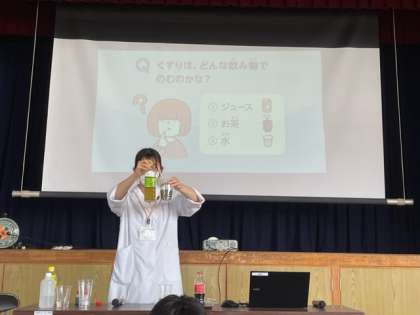 5時間目に、学校薬剤師さんをお招きして、お薬教室をしていただきました。薬の正しい飲み方や、違法薬物の話や実験をしていただき、よくわかりました。