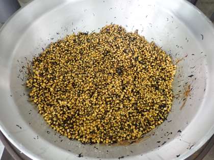ひじき豆は、油であげた大豆にひじき、砂糖、こいくちしょうゆを合わせたたれをからませて作ります。