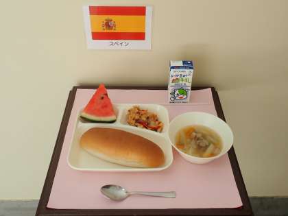 今日の給食には、パエリアとすいかが登場しました。