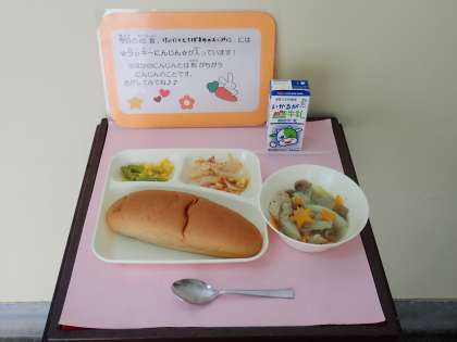今日の給食には、じゃがいもとトマトのチーズ焼きが登場しました。