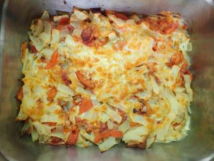 ベーコン、じゃがいも、トマトの上にチーズをのせて焼き物機で焼きます。