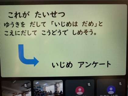 今日は、リモートで児童朝会がありました。その中で、校長先生からいじめについてのお話がありました。今日から1年生から6年生まで全員が「いじめアンケート」を行います。みんなで勇気を出して行動に移し、小松小学校をより安心・安全な場所にしていきましょう。