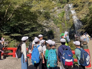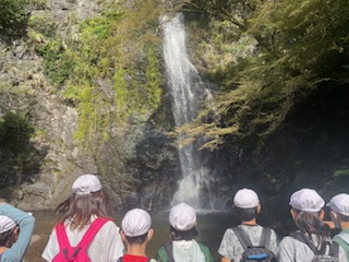 道中の自然や生き物に興味を持ち、真剣に観察している姿もありました。箕面大滝は涼しく、虹がかかっていてとても綺麗でした。長い距離を歩いて疲れた子どもたちは滝に癒されていました。