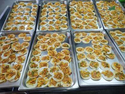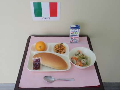 大阪市の給食では、ぎょうざの皮に、ツナ、コーン、ピーマン、ピザソース、チーズを混ぜ合わせた具を載せ、焼き物機で焼いています。