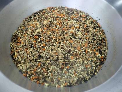 さごしのごまじょうゆかけにさごしといりごまを、うすくず汁にさといも、はくさい、だいこん、たまねぎ、みつば、しいたけを、大豆の煮ものに大豆、うすあげ、にんじん、ひじきを使っています。