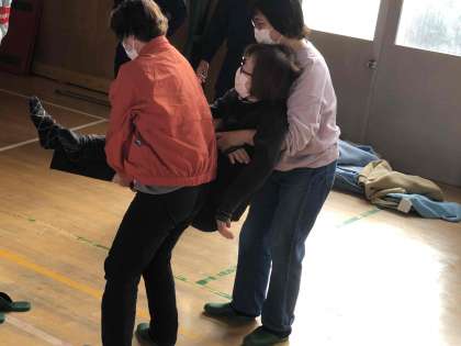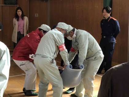 最後には、消防署の方から救助や搬送、応急手当の仕方を教えてもらいました。救助や搬送、応急手当では、身近ある生活品を利用して近所の方と一緒に確認し合いました。