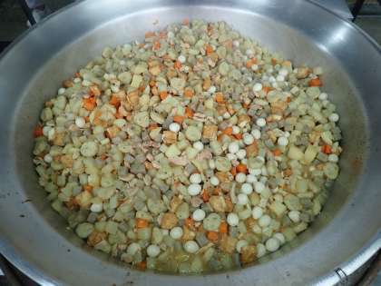 今日の給食では、鶏肉、うずら卵、ごぼう平天、じゃがいも、こんにゃく、あつあげ、だいこん、にんじんが入っています。