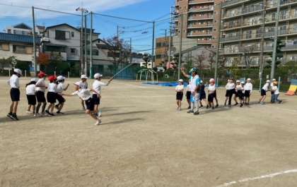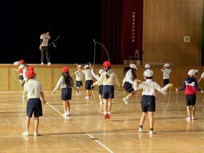 12月、急に寒くなりましたがなわとび週間、大なわ大会にむけて子どもたち頑張っています。上は1年生、下は2年生の体育の授業の様子です。