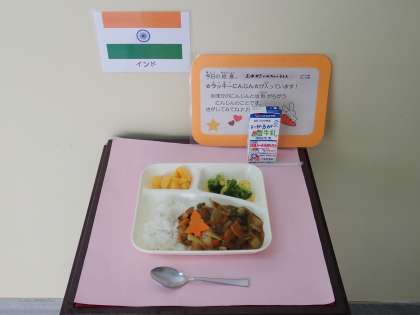 今日の給食には、冬野菜のカレーライスとブロッコリーとコーンのサラダが出ました。