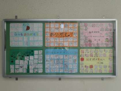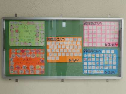 その翌週から給食調理員さんに書いた手紙を給食掲示板に貼って、1か月かけて見せ合いました。
