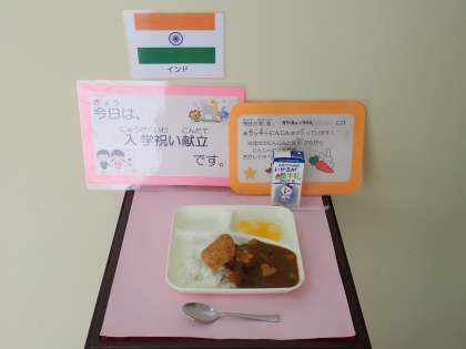 今日の給食は、みなさんが小学生になったお祝いの献立です。