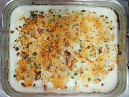 今日のマカロニグラタンは、鶏肉とたまねぎをいためたものに、クリーム、小麦粉、牛乳、グリンピース、マカロニを加え、チーズとパン粉をふって焼いています。