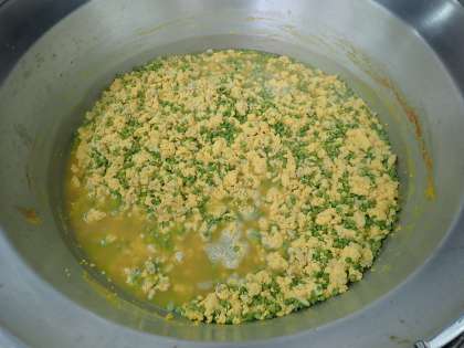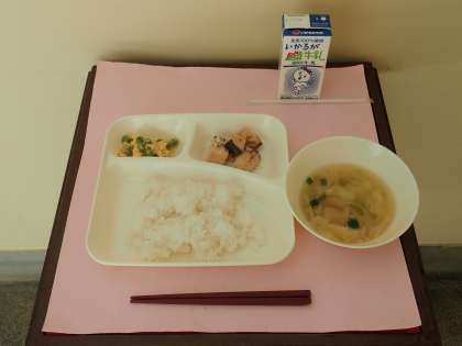 今日の給食には、年に1回のえんどうの卵とじが出ました。