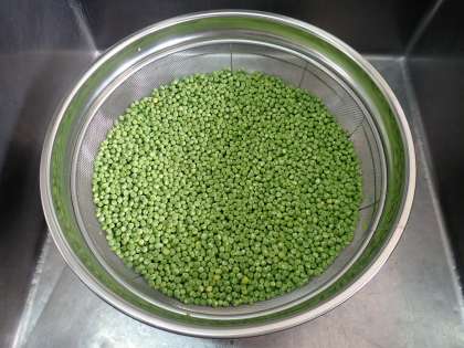 今日は、給食室でさやから取り出したえんどうを使っています。