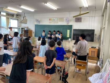 今日は、今年度からリニューアルして始まった「にこにこ班活動」の日です。1年生と6年生、2年生と4年生、3年生と5年生が各教室に分かれて、それぞれ工夫して仲良く「にこにこ」なる活動をしました。