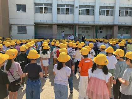 初めて外で全校朝会をしました。