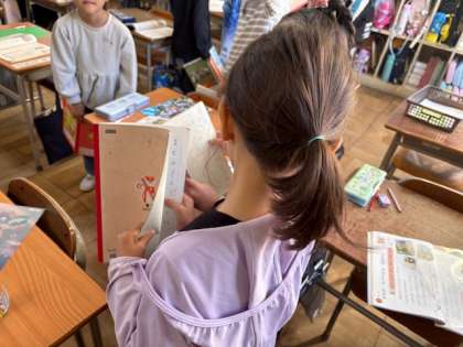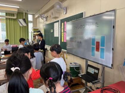 国語で、友だちに発表し合いをしています。また、だじゃれの学習もしました。色々なだじゃれがうまれて、面白かったです^_^
