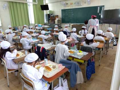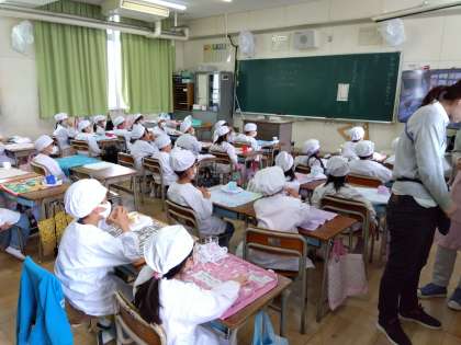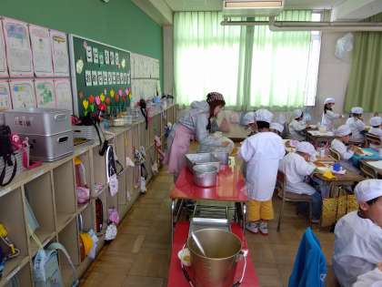 給食は3日目になりました。1年生の給食は6年生がお手伝いをしています。少し早めに、行儀よく準備をして、食べることができていました。