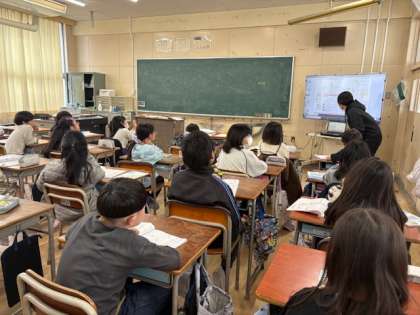 社会の学習で、校区内にどんなものがあるかを話し合っています。