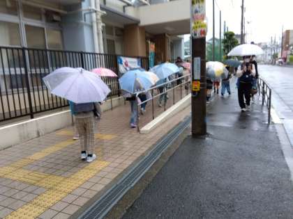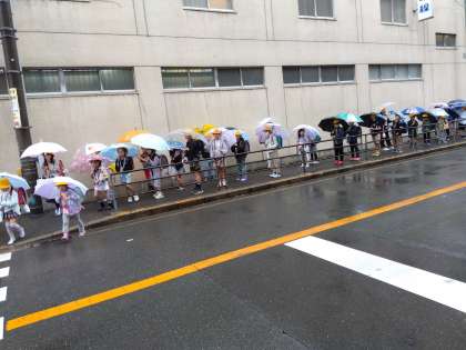 5月2日(金)の登校の様子です。傘をさしての登校は玄関付近が大変込み合いますが、子どもたちはルールを守って落ち着いて登校することができています。