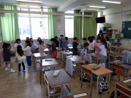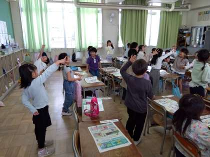 1年生の音楽の様子です。リズムに合わせてからだを動かしました。