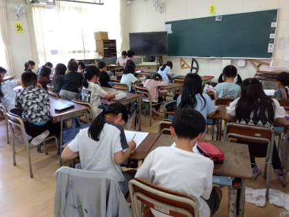 3年生の授業の様子です。社会では大阪市の地域の様子について学習しています。工場がどのようなところにあるのかを考えたり、習ったことをテストしたりしました。また、総合の時間にはいじめについて標語を考えました。