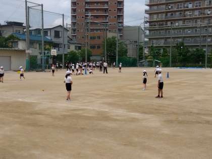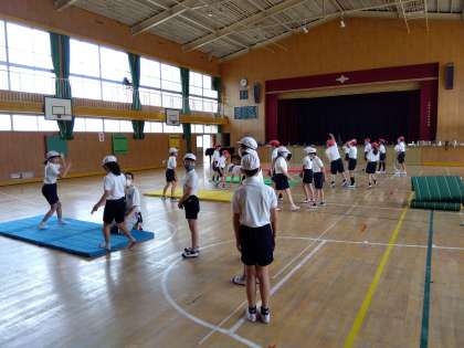 体育館での5年生のマット運動の学習と、運動場での3年生のボール投げ、鉄棒の様子です。