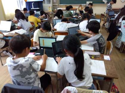 4年生の国語では、わたしのクラスの「生き物図かん」の単元でリーフレットを作成しています。写真はリーフレットの作成に向け、学習者用端末等を使って調べ学習をしているところです。