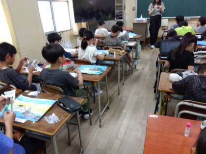 4年生の図工では絵の具で描いた背景に複雑な模様の魚を泳がせています。細かい作業ですが集中して取り組んでいます。