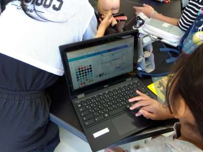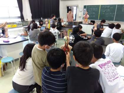 6年生の理科ではからだのしくみを学習しています。人体模型を使って各器官がどこにあるのかを確認し、学習者用端末をつかってまとめています。