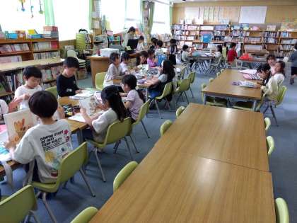 毎週金曜日は司書の先生が図書の指導や図書室の整備をしてくださっています。写真は1年生の様子です。静かに楽しく読書に取り組みました。
