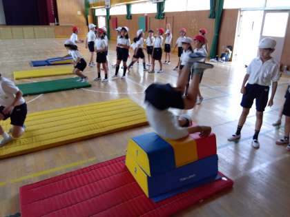 3年生の体育ではマット運動で前転に取り組みました。台の上でも回ることができていました。