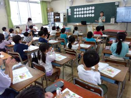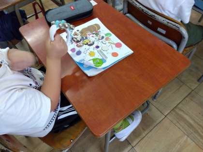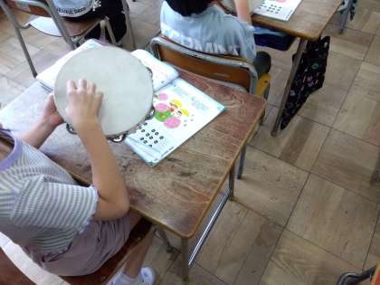 1年生の音楽では、カタツムリの歌に合わせて、タンバリン、カスタネット、鈴でリズムをとりました。それぞれのパートの叩くタイミングが違うので、みんなで息を合わせてがんばりました。